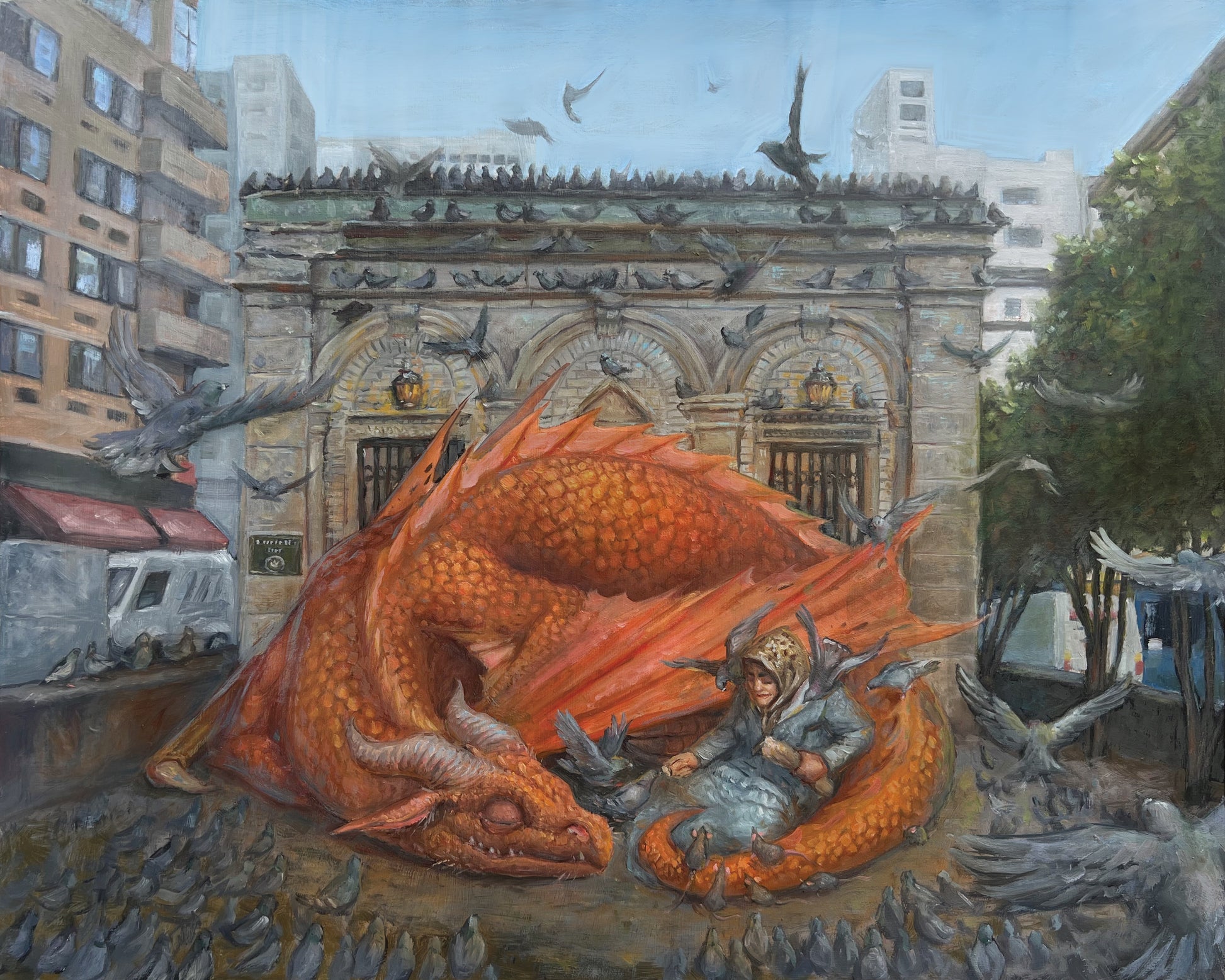 Local “pigeon woman” often seen joining resident red dragon during its afternoon nap for bird feedings. They seem to be old friends.